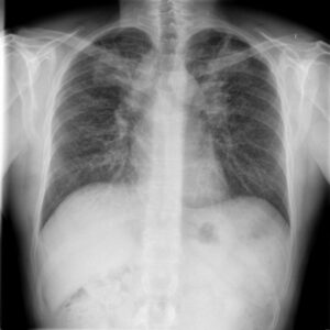 Two chest X-rays of a patient with silicosis taken one year apart, showing the progression of fibrosis.