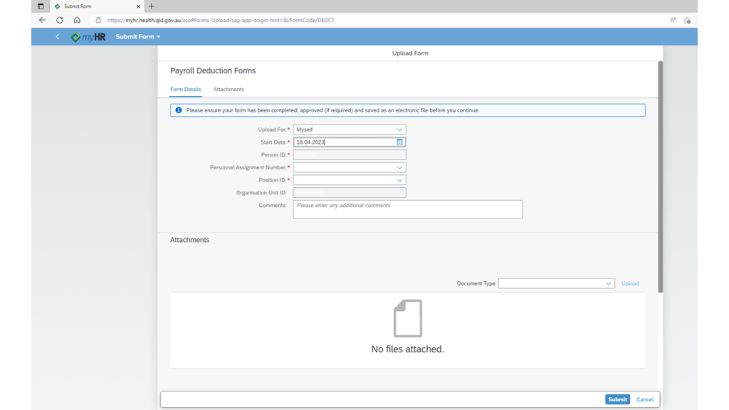 Once complete, upload your Payroll Deductions form via the MyHR portal for Queensland Health employees.